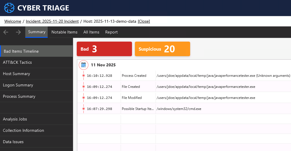 Cyber Triage can ingest EDR telemetry, output from its own collector, disk images, and KAPE. This is how that same data looks in Cyber Triage: